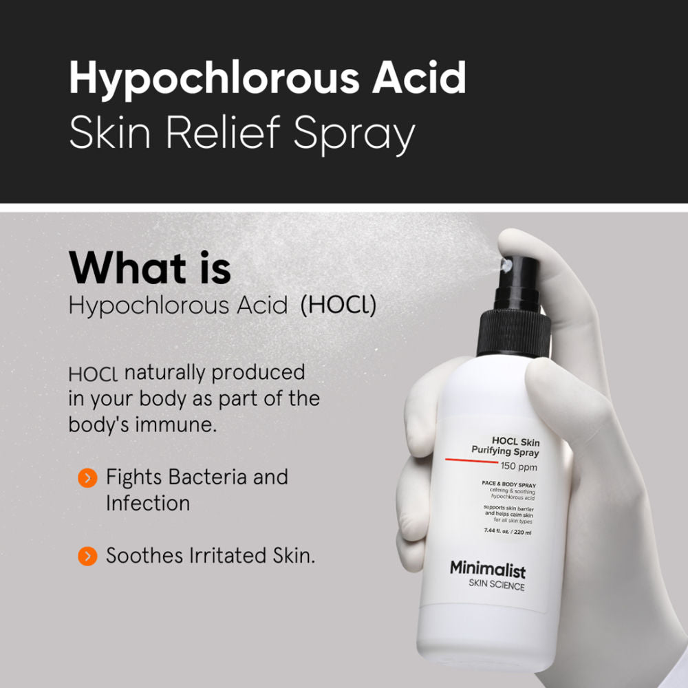 Purify and protect your skin with Minimalist HOCL Skin Purifying Spray. This 220ml face and body spray, featuring 150ppm Hypochlorous Acid (HOCL), effectively cleanses, calms irritation, and supports skin health. Ideal for post-workout, breakouts, or daily refreshing, it's gentle yet powerful for all skin types.